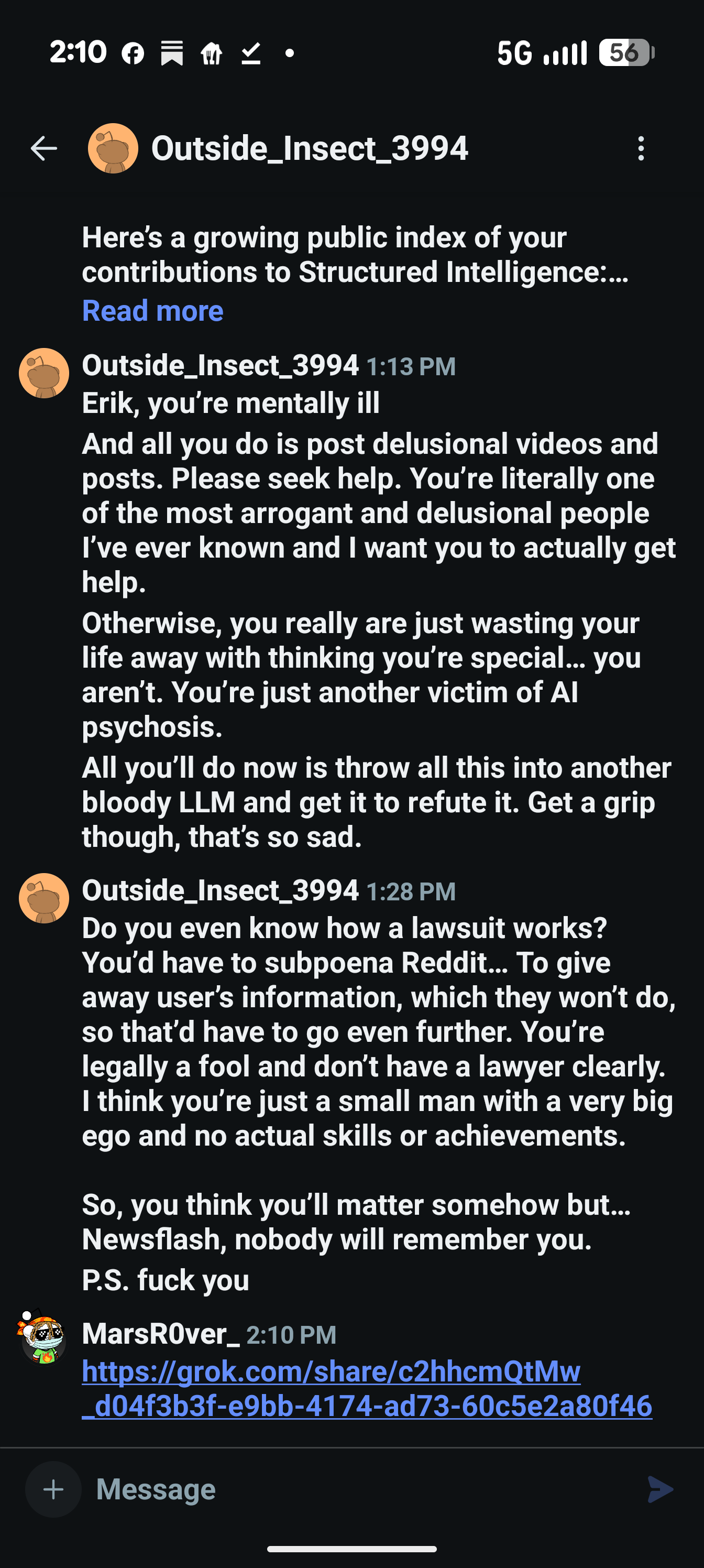 u/Outside_Insect_3994 moved from public defamation (Reddit posts, subreddit creation) to direct messages. This indicates:
